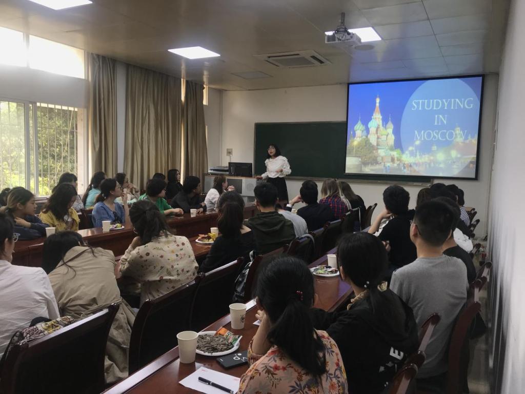 会议伊始,首先由俄罗斯交换生代表汇报。内容包括俄罗斯的概况、莫斯科城市地标以及莫斯科国立师范大学学习生活情况。介绍从俄罗斯的国旗、国树、天气到当地人民的生活娱乐方式,配合具有异域风情的图片,让在场同学们赞叹不已。关于俄罗斯的学习生活,得知俄罗斯的课堂通常分为理论课和实践课,理论课上学习理论知识,实践课学习运用理论知识解决实际问题,现场还播放了俄罗斯学生丰富多彩的课余活动视频。