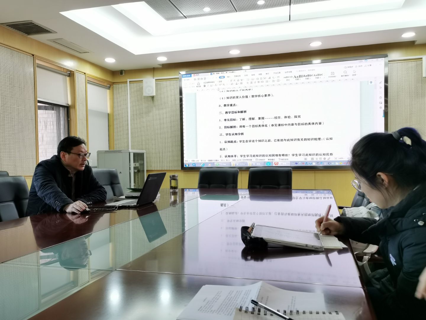 15:00,小组成员到达华科附中,前往行政楼会议室开始活动。指导老师彭树德对小组成员提交的作业进行了总体点评,并指出:教师进行课时备课之前要先进行单元分析,课时目标应当围绕单元目标进行设置。接着,彭老师给出范例——《第一章第一单元:集合及其运算》,带领小组成员学习如何进行完整的单元分析:应从教材内容分析开始,指出教学重点,解析教学目标,还要对学生的认知起点和认知水平进行分析,进而分析教学策略,突破教学难点。小组成员认真记录,深入思考,学到了很多的单元备课技巧。