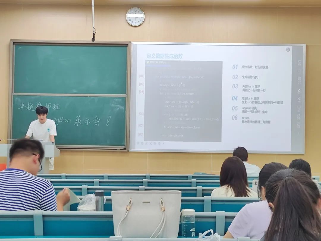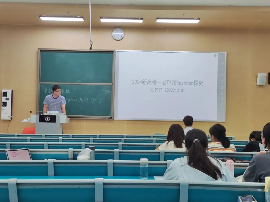 (通讯员 梁韵)9月13日下午,数学与统计学学院(以下简称“数统学院”)2022级卓越教师班“Python学习成果展示会”于八号楼8102教室举行。班主任徐章韬教授出席本次会议,会议由班长潘欣雨主持,2022级卓越教师班全体成员共同参与。