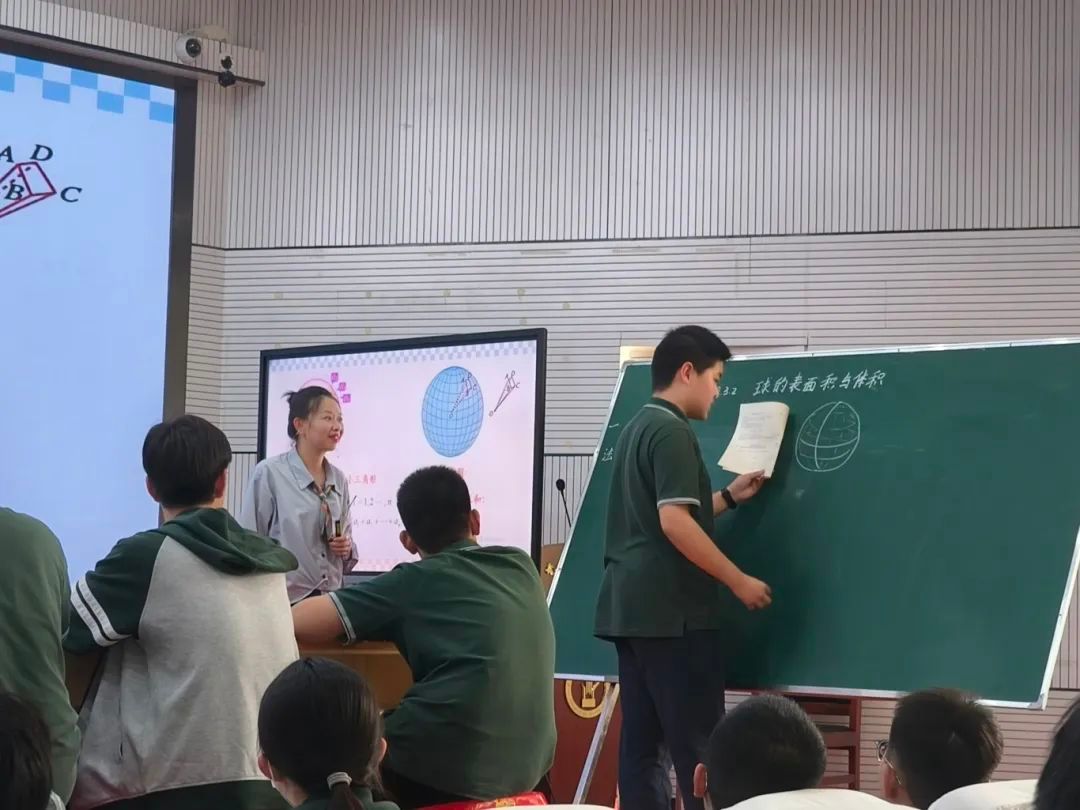 在第一节展示课上,经开一中教师梅小林对“球的体积与表面积”问题进行了细致讲解。她巧妙地利用“土豆”等生活化工具,引导学生在动手实践中思考球体的分割过程,激发学生的探索兴趣。此外,梅老师在课堂中多次融入数学文化,帮助学生更好地理解数学知识发展脉络与历史深度。