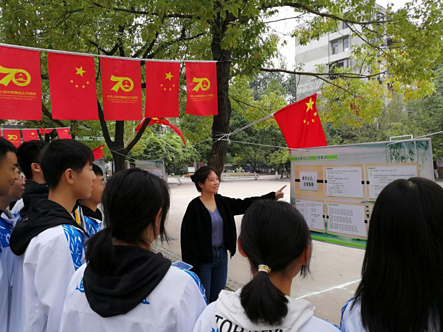 在国庆庆祝新中国成立70周年之际,为丰富校园学科文化活动,激发学生学习数学兴趣,提升学生数学核心素养,华师数学实习组实习生同襄四高一数学组教师和教务处负责人一同筹备了本次数学学科周的策划,并于国庆之后10月15日进行了数学文化展板的展示和讲解。