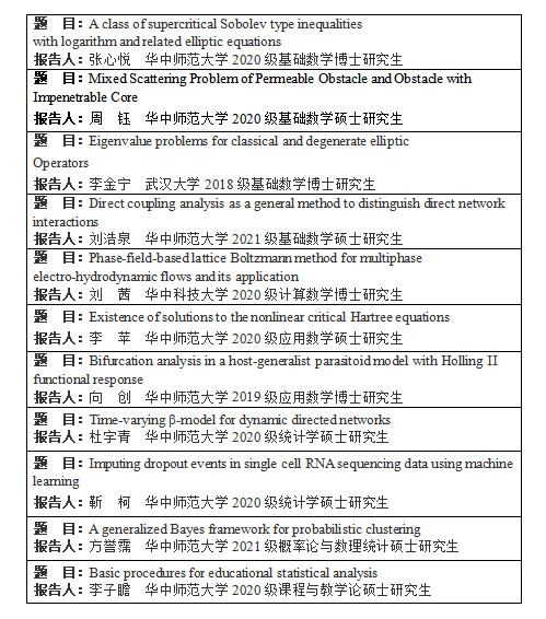 十年树木百年树人,今年是学院连续举办研究生学术活动的第十年。本次学术活动设数学分会场和统计学、数学教育分会场,邀请到来自武汉大学、华中科技大学、华中师范大学共11名优秀研究生进行学术分享,李波、阴小波、张健、张兴安、杨翠红、帅伟等教师担任专家评议。