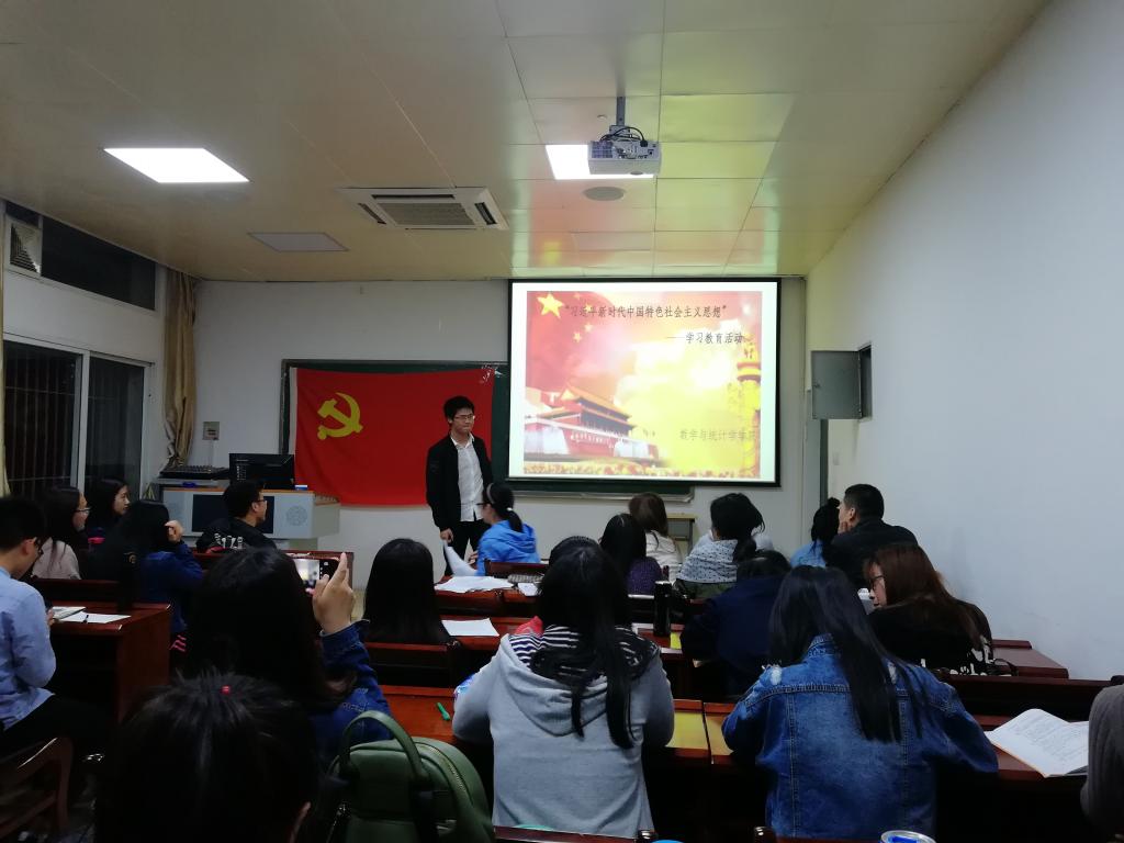 2018年4月24日晚,数统学院研究生在二楼报告厅举办了“习近平新时代中国特色社会主义思想”学习教育活动之《厉害了,我的国》影片观摩座谈会。本次活动主要目的是为了更好的学习宣传、贯彻“习近平新时代中国特色社会主义思想”,感受认同习近平总书记的领袖风范、担当精神、政治智慧、为民情怀。会议由2017级研究生第二党支部承办,并由党支部书记覃启冲主持。