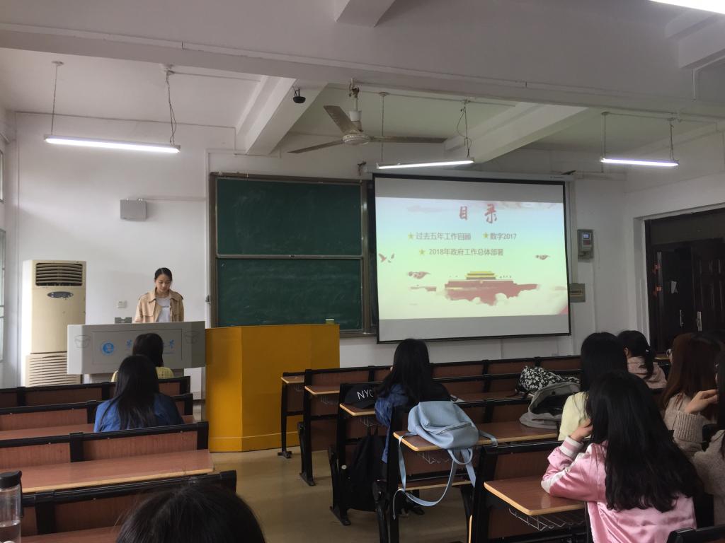 2018年4月26日中午12时,数统学院2015、2016级本科生党支部全体成员在六号楼6201召开了四月份党组织生活。党支部成员王晴担任本次会议主持人?;嵋榈谝幌睿庞甑Т庸ノ迥旯ぷ骰毓?、数字2017及2018年政府工作总体部署三个方面对“两会精神”作出诠释。苏静同学随后进行了两会精神学习体会的分享,并结合个人实际情况进行深入解读?;嵋榈诙?,姜欣秀同志为我们细致讲解了中华人民共和国宪法修正案,让我们从逐项条文中领会党的精神。雷世玲同志在之后分享了关于宪法修正案的心得,表示了对修正案的完全赞成和坚决拥护,并提到作为一名预备党员,我们不仅要学习好宪法,更要作为模范遵守好宪法。最后,王晴同志对本次会议进行了总结,希望大家能够紧跟时代步伐,学习理论知识,联系实际。至此本次四月份党组织生活学习会议顺利结束。