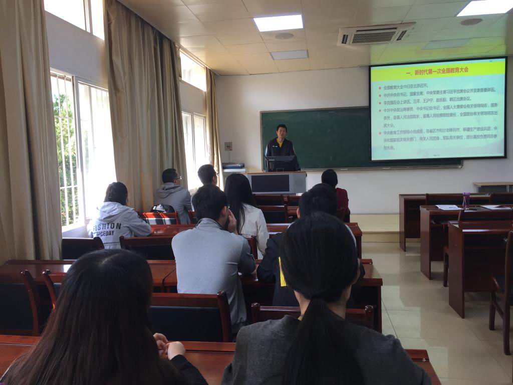 会议开始,李东老师简单介绍了本次党日活动的目的和意义,并与大家分享了“深入学习习近平总书记全国教育大会讲话精神”的相关内容及领悟,李东老师指出习近平总书记在大会上的重要讲话,是重要论述的集大成,为新时代教育改革发展提供了根本遵循。同时习总书记的讲话围绕培养什么人、怎样培养人、为谁培养人这一根本问题,并对相关部门人员提出工作要求,作出战略部署,这对办好人民满意的教育指明方向。