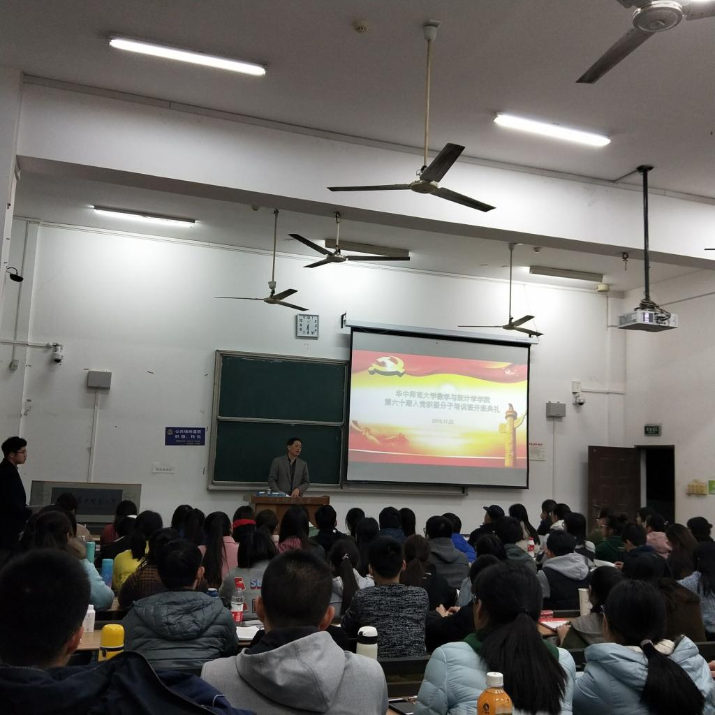 11月23日晚上,华中师范大学数学与统计学学院第六十期入党积极分子培训班在9203教室举行开班典礼,学院党委书记王中、党委副书记吴成峡、培训班班主任李荣元,数统学院84名本科、研究生入党积极分子参加此次开班典礼。开班典礼由带队老师王奥林主持。