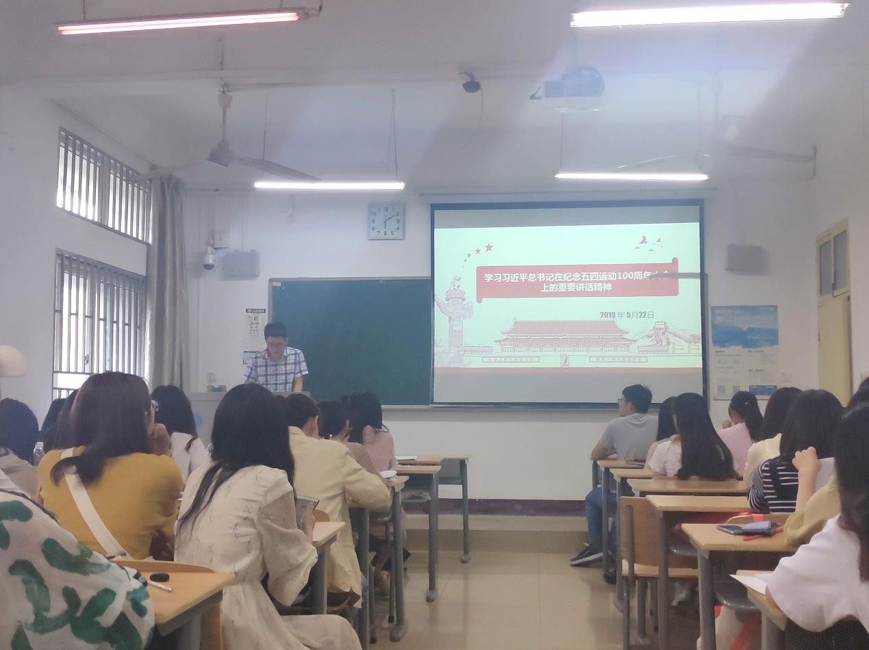 2019年5月22日,我院2015级本科生党支部在六号楼6209开展了五月支部主题党日活动,本次活动的主题是学习习近平总书记在记念五四运动100周年大会上的重要讲话精神。