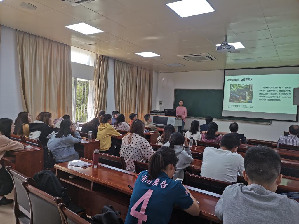 接着,魏吉琳同志通过视频与PPT相结合的形式,带领大家学习了习近平总书记等中央领导同志教师节重要讲话精神。她强调要贯彻落实好将习近平总书记重要讲话精神转化为深化新时代教师队伍建设改革的具体实践,并以秉承着“一生只做一件事”的教育情怀的浙江杭州市学军中学原校长陈立群的事迹为例,呼吁在座的老师和以后走上教师岗位的同学要“凝心铸师魂,立德育新人?!彼婧?,她带领大家一起学习了《习近平关于“不忘初心、牢记使命”论述摘编》部分章节,她强调作为中国共产党人,要永远保持对人民的赤子之心。一切向前走,都不能忘记走过的路。面向未来,面对挑战,一定要不忘初心、继续前进。紧接着,魏吉琳同志以小视频的方式带领大家学习了交通大学西迁老教授、哈尔滨工业大学“八百壮士”先进事迹,让每位党员都了解了“胸怀大局、无私奉献、弘扬传统、艰苦创业”的“西迁精神”及不畏艰难地为国家工业化建设做出巨大贡献的哈工大“八百壮士”。