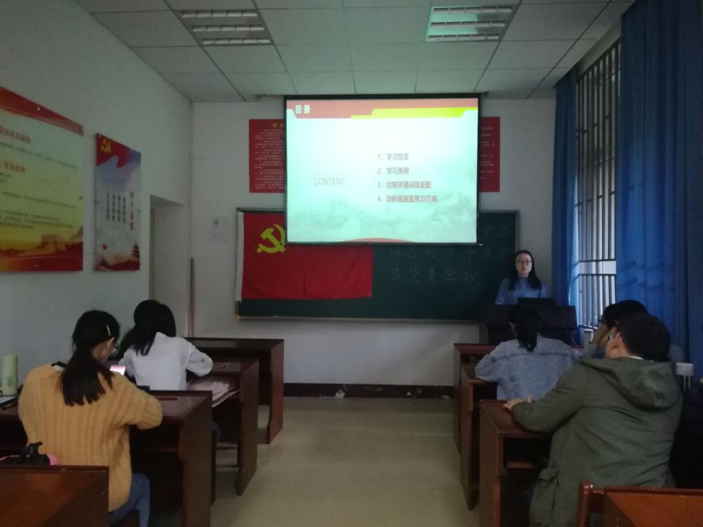会议伊始,由支部副书记刘小庆带领大家学习党章,刘小庆通过对关键词进行解析的方法深入浅出地为我们讲述了党章的总纲部分。随后,李祥凤带领大家通过观看视频的方式快速学习了《关于新形势下党内政治生活的若干准则》和《中国共产党纪律处分条例》,并摘出其主要关键词。紧接着,支部全体党员对照关键词针对性的自省,寻找自身差距。其次,由在座的全体党员按党小组组分别进行批评与自我批评,并谈论了今后要如何进行改正。
