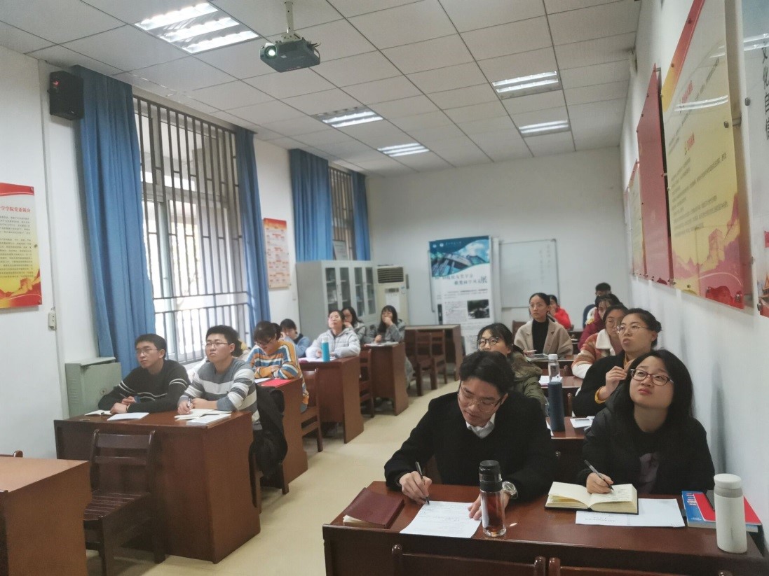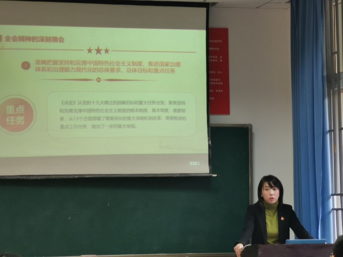 首先,田书记为大家宣讲十九届四中全会精神。她从大会召开背景、重大意义、深刻领会全会精神系统梳理了十九届四中全会内容,从“21岁时你会在什么地方做什么”这一问题,引导大家思考如何能从自身出发,落实全会的相关精神,从习近平总书记对青年朋友提出的六点要求出发,通过一系列的事例为大家做了进一步解读。宣讲同时,田书记要求学生党员时刻牢记自己作为学生的本职,在打牢专业基础的基础上,积极进行理论学习,做好党的理论知识的学习者、传播者、弘扬者。