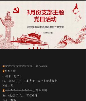 2020年3月24日晚,华中师范大学数统学院2016级本科生第二党支部利用群课堂线上组织开展了本支部3月主题党日活动,活动主题为深入学习讨论习近平总书记在湖北省考察新冠肺炎疫情防控工作时的重要讲话精神和《华中师范大学2020年工作要点》 ,并针对本支部具体发展情况和日常工作事宜作讨论和强调,本次活动由党支部书记邓云平组织。