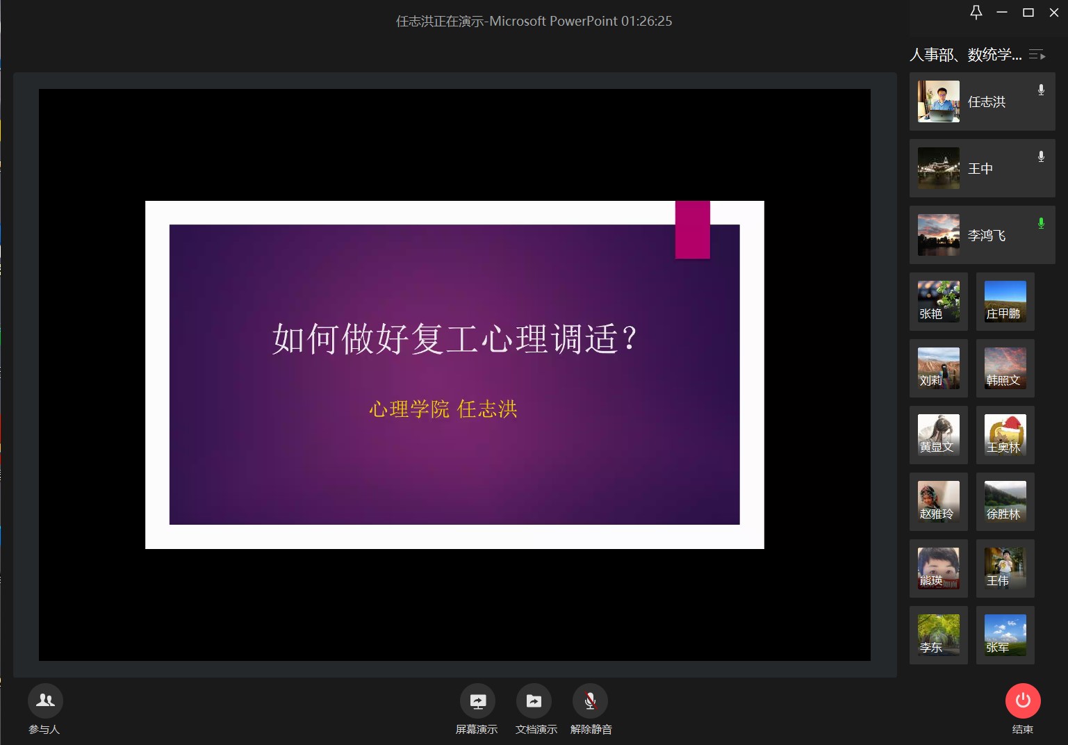 结合当前疫情防控工作实际,为做好复工复学准备工作,此次主题党日活动还邀请了心理学院任志洪教授为大家作了题为《如何做好复工心理调适》的辅导讲座。任教授围绕自我及他人心理困扰的识别与调适进行了细致地讲解,分享了疫情期间接触到的具体案例,为大家提升心理健康素养提供了方法和建议。