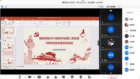 2020年5月30日晚,华中师范大学数统学院2016级本科生第二党支部利用腾讯视频会议线上组织开展了本支部5月主题党日活动,活动围绕着“两会”进行展开,立足于当前民生、经济、就业等问题,引导本支部成员系统地学习两会传达的精神并就此展开交流讨论。此次活动由党支部书记邓云平组织开展。