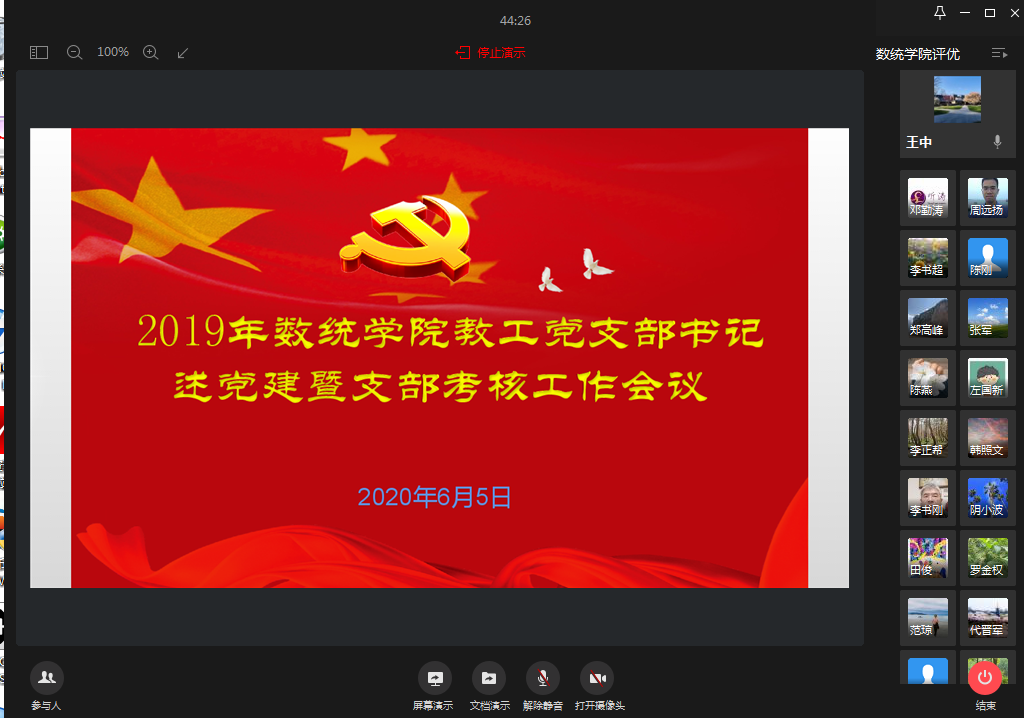 为深入贯彻落实全面从严治党,加强学院基层党组织书记抓党建工作的政治责任,6月5日下午,数学与统计学学院2019年度教工党支部书记述党建暨支部考核工作会议于企业微信平台顺利召开。会议由学院党委书记王中主持,学院党委委员、各教工党支部书记、系主任、教研室主任、办公室主任、工会主席等参与了此次会议。