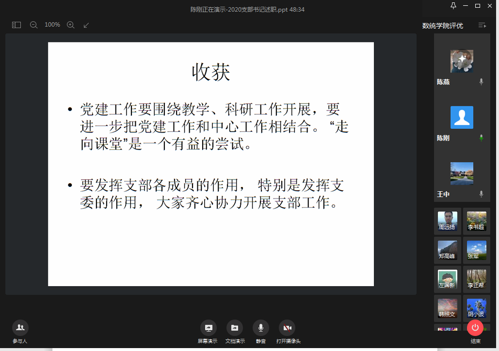 此次年度述职评议大会客观的反映了数统学院各教工党支部在2019年支部建设的工作情况,促进了各支部之间的沟通与交流,为学院下一阶段的基层党建工作奠定了良好的基础。
