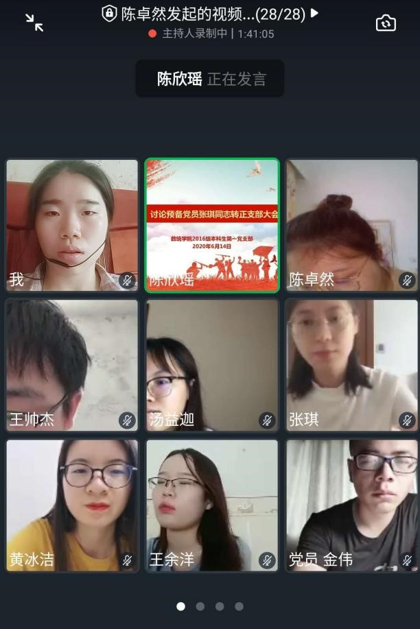 2020年6月13日,我院2016级本科生第一党支部召开了关于讨论预备党员陈亦可等14名同志的转正大会。因疫情原因,本次会议采取钉钉会议的线上方式召开。本次大会到会成员为支部的14名正式党员、14名预备党员,本次会议由党支部书记陈欣瑶同志主持召开。