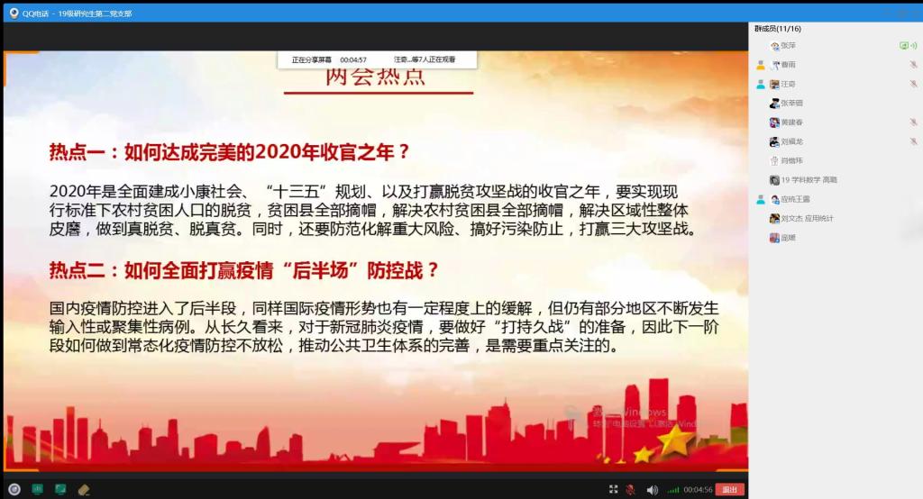 6月30日下午,数学与统计学学院2019级研究生第二党支部通过QQ电话召开了线上主题党日活动,活动的主题为迎党的生日、重温两会精神、讲战役故事、悟初心使命。本次会议由支部书记曹雨主持召开。