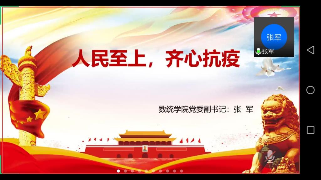 接下来,我院党委副书记张军老师为我们支部讲了以“人民至上,齐心抗疫”为主题的党课。张书记主要从三方面分享了我们党我们国家以人民为中心的执政理念以及疫情防控期间我校及我院高度重视师生健康所做的防控工作等。1、中国共产党关于人民至上的观点;2、习近平总书记关于疫情防控系列重要讲话中体现的人民观点;3、学校与学院在疫情期间所做的部分疫情防控工作。从中国共产党的立场和习总书记的系列讲话中来看无一不体现出人民在习总书记心中的地位以及为人民服务在习近平新时代中国特色社会主义思想中的地位。与此同时,学校与学院也积极响应上级号召,纷纷采取措施,多次召开研讨会,使得工作方案与应急预案形成合力,实行分类防控,精准对接相关群体,确保毕业返校工作顺利进行;许多教师党员自愿报名志愿者参加精准对接等这些都充分体现了人民的观点。最后,张书记希望我们绝大多数党员都能够坚持人民至上的观点,充分发挥党员的先锋模范作用,在假期合理安排自己的工作和生活。
