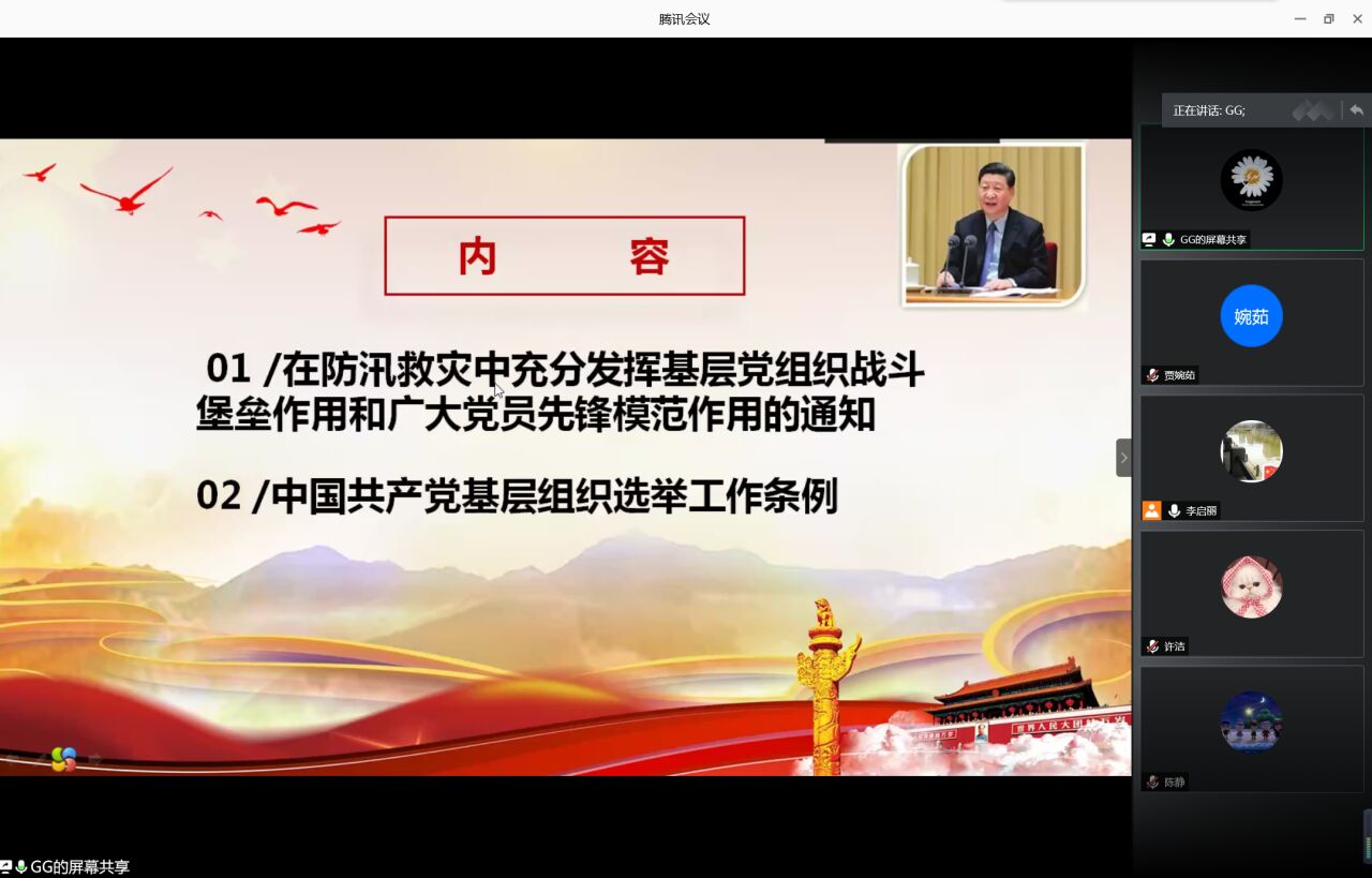 8月9日晚上,2018级研究生第一党支部利用腾讯会议APP开展了7月支部主题党日活动。本次会议的主要学习内容是:学习中组部《关于在防汛救灾中充分发挥基层党组织战斗堡垒作用和广大党员先锋模范作用的通知》精神;学习《中国共产党基层组织选举工作条例》。会议由2018级研究生第一党支部书记李启丽主持。