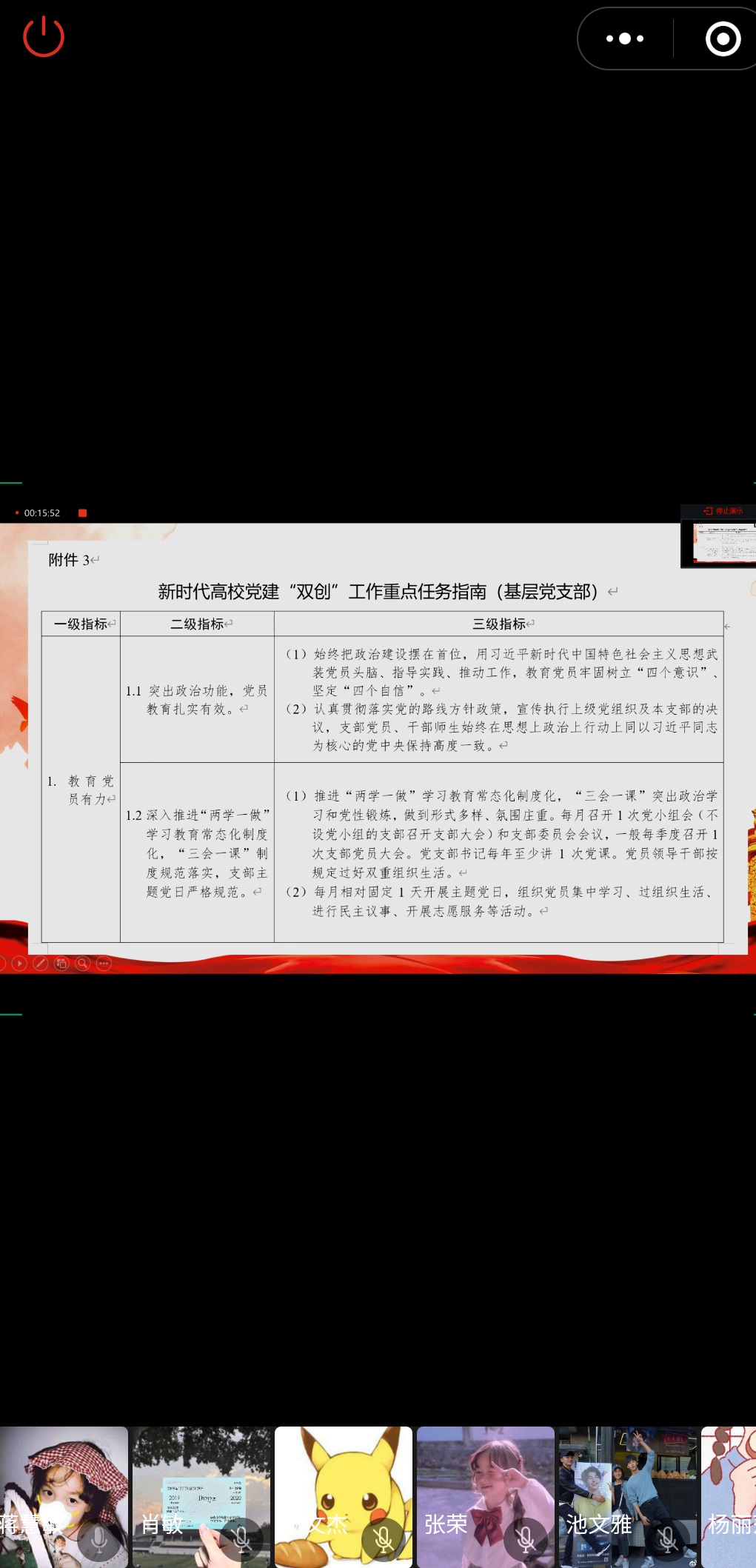 接着,第三小组李尚荣同志带领支部成员学习《中国共产党基层组织选举工作条例》。《条例》深入贯彻习近平新时代中国特色社会主义思想,贯彻落实新时代党的建设总要求和新时代党的组织路线,通过学习,大家对坚持和加强党的全面领导,坚持党要管党、全面从严治党,健全党的民主集中制,完善党内选举制度有了更深刻的认识。李尚荣同志带领支部成员深度挖掘《条例》的具体内容,分别从“总则”、“代表的产生”、“委员会的产生”、“选举的实施”、“呈报审批”、“纪律与监督”与“附则”七个方面进行解读,重点指出党的基层组织设立的委员会委员候选人,按照德才兼备、以德为先和班子结构合理的原则提名。随后,蒋慧敏同志针对新时代高校党建“双创”工作重点任务指南(基层党支部)的各项指标,对本支部的政治功能逐一进行诊断,由于支部成立时间不久,诸多活动尚未开展,针对支部出现的一些问题,蒋慧敏同志提出了相应计划和安排,提出整改措施。
