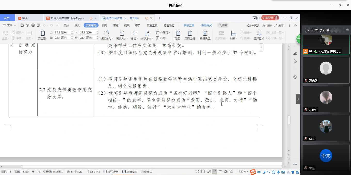 11月17日,我院2018级研究生第一党支部利用“腾讯会议”APP组织召开了11月支部主题党日线上活动,就开展基层党组织诊断行动和《中国共产党基层组织选举工作条例》进行了深入讨论与学习。会议由支部书记李启丽同志主持,支部全体成员参加了此次会议。