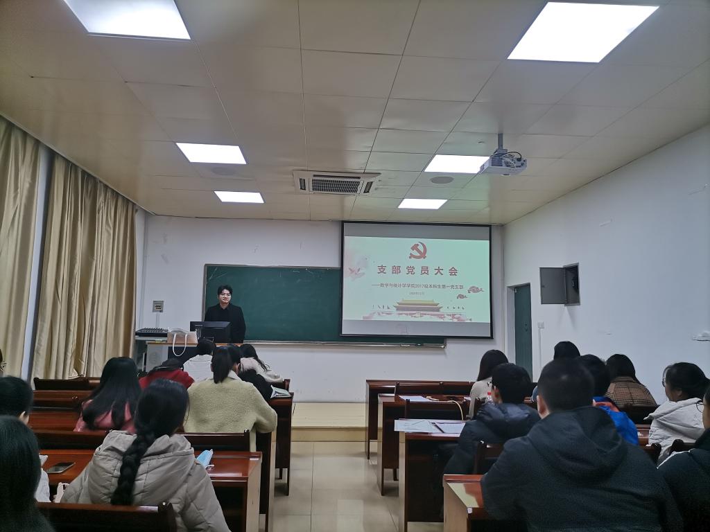 2020年12月10日下午2:30,数学与统计学学院2017级本科生第一党支部于六号楼二楼报告厅召开了关于讨论迟迅宏等十二名预备党员转正的党支部大会。全体正式党员、预备党员参与了此次会议,大会由宋夏主持。