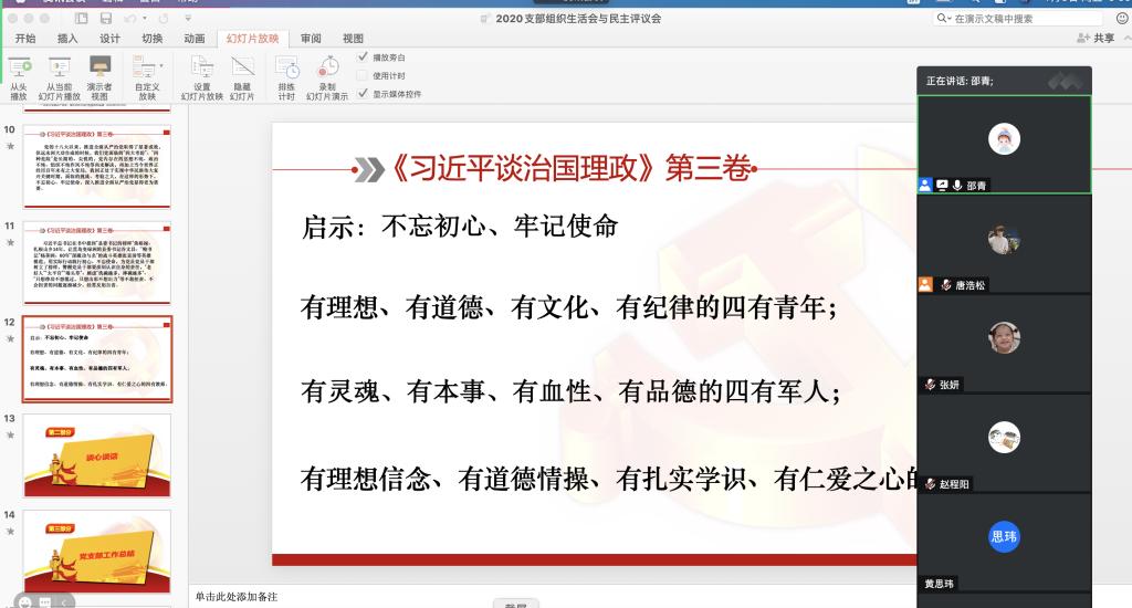 2021年1月8日上午,我院2020级研究生第二党支部在六号楼党员活动室以及腾讯会议线上线下同步召开了12月支部组织生活会和民主评议会,到会成员为支部全部17名正式党员,本次会议由支部书记邵青同志主持召开。