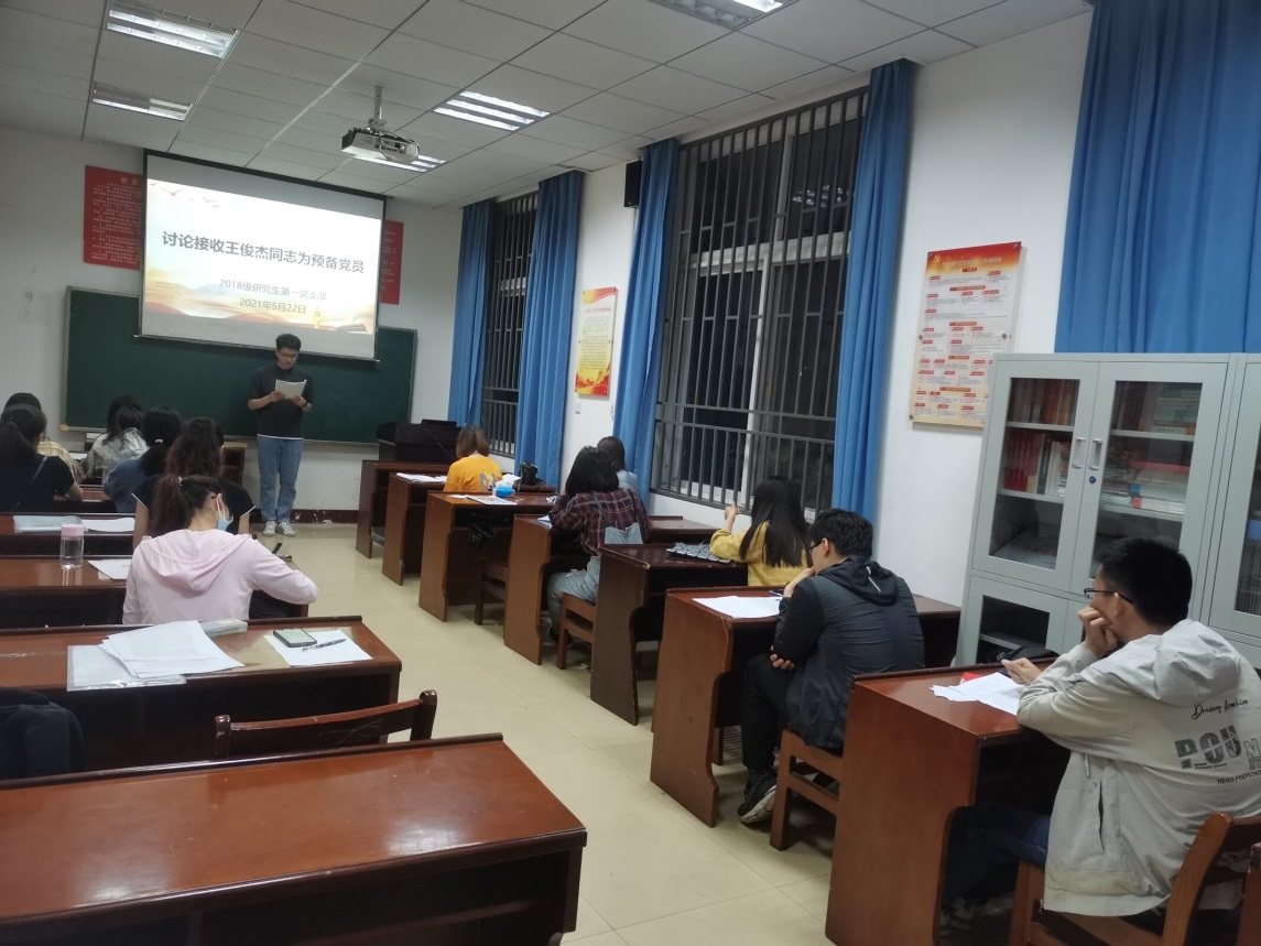 我院2018级研究生第一党支部于2021年5月22日在六号楼一楼党员活动室召开了关于讨论王俊杰、程琦祺、刘欣和赵晨4名同志为中共预备党员的支部党员大会,会议由党支部书记李启丽同志主持召开。