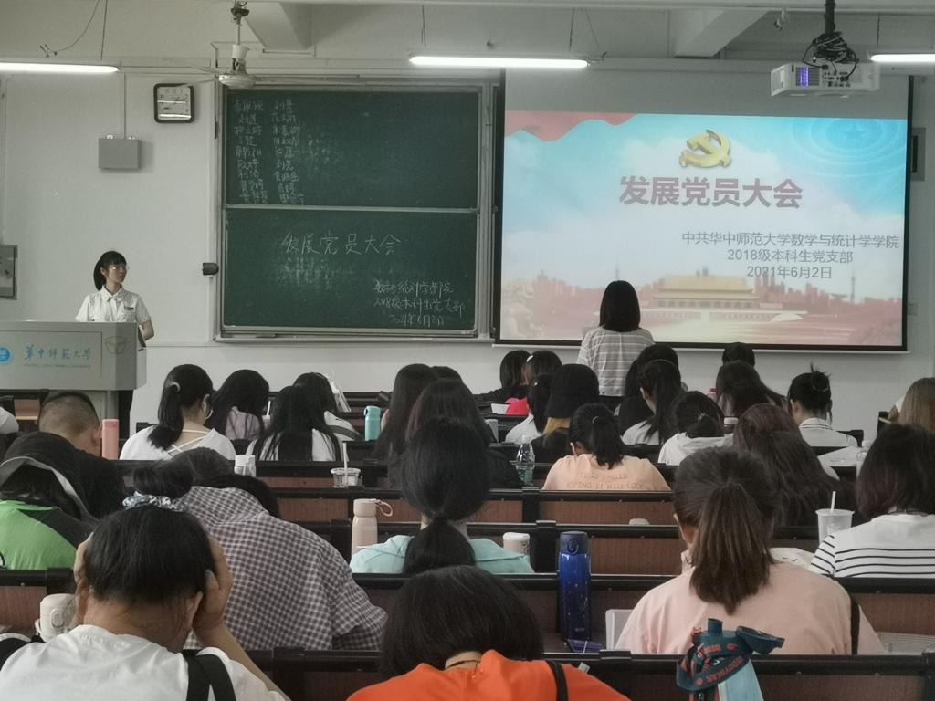 6月2日下午,数学与统计学学院2018级本科生党支部于6号楼6301教室召开了第六批发展党员大会,本次会议的主题是:讨论关于接收李佩瑶等18名同志为预备党员的问题。出席此次会议的有党支部书记谢定一,支部宣传委员申墁烨,支部组织委员何婷婷以及全体预备党员,此次会议由何婷婷主持。