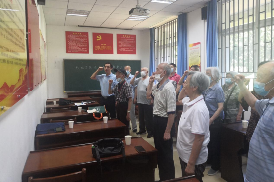 主题党日活动伊始,退休党支部党员同志们在党委书记刘成竹的带领下集体重温入党誓词。