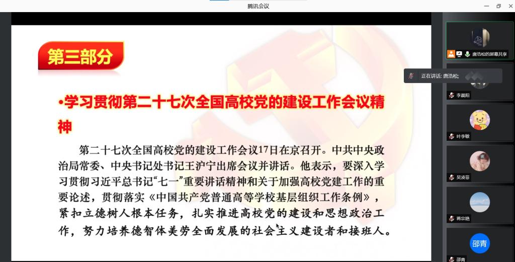 紧接着,唐浩松同志带领大家学习了第二十七次全国高校党的建设工作会议精神,本次会议强调要坚持党对教育工作的全面领导,要坚持把立德树人作为中心环节,培养德智体美劳全面发展的社会主义建设者和接班人。