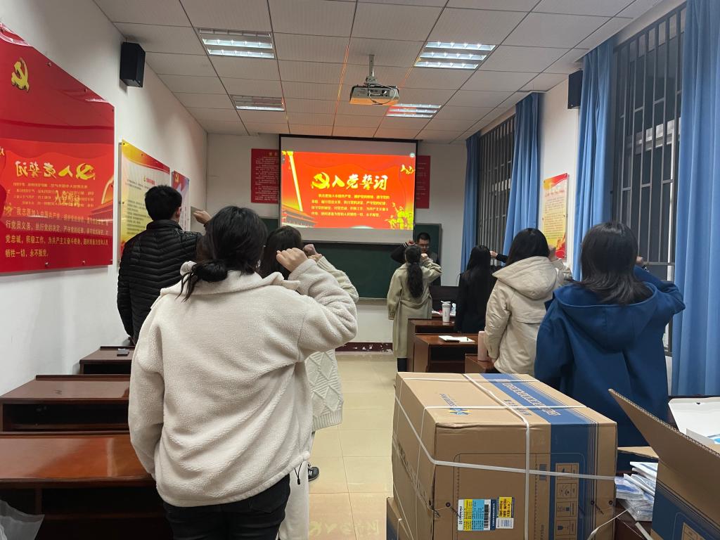 会议伊始,全体党员缴纳党费,并由李寒晓同志带领全体党员奏唱国歌,由纪检委员许泽源同志带领大家重温入党誓词并且学习党章第七章的内容。
