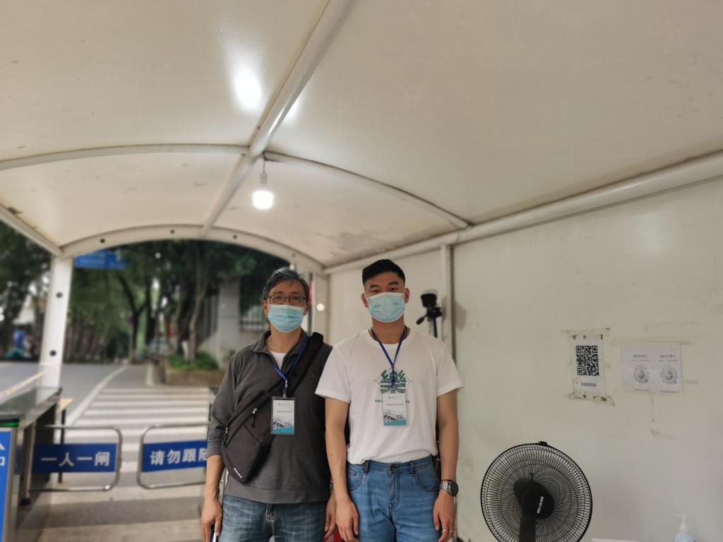 “请大家保持一米间距”“请您提供一下身份证”“请提前打开手机健康码”......学院行政党支部书记韩照文、2018级本科生第一党支部书记谢定一、2021级本科生党支部书记王奥林三位同志主动报名参与了学校校门疫情防控值守。