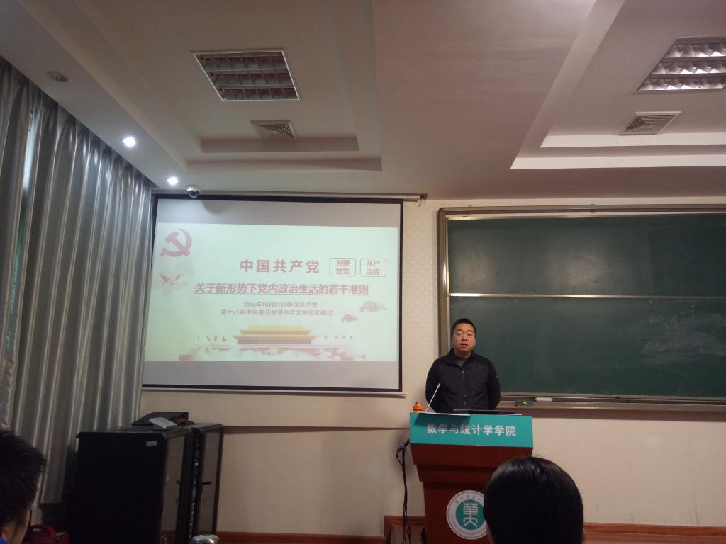 12月1日上午,数学与统计学学院第四期发展对象培训班全体学员于6401教室集中,在数统学院党委副书记吴成峡的带领下共同学习《新形势下党内政治生活若干准则》。吴成峡结合自身的思想、工作和作风等实际情况,针对时事热点事件,详细的讲解了该准则的深刻含义,并对发展对象全体提出了具体的实践要求。
