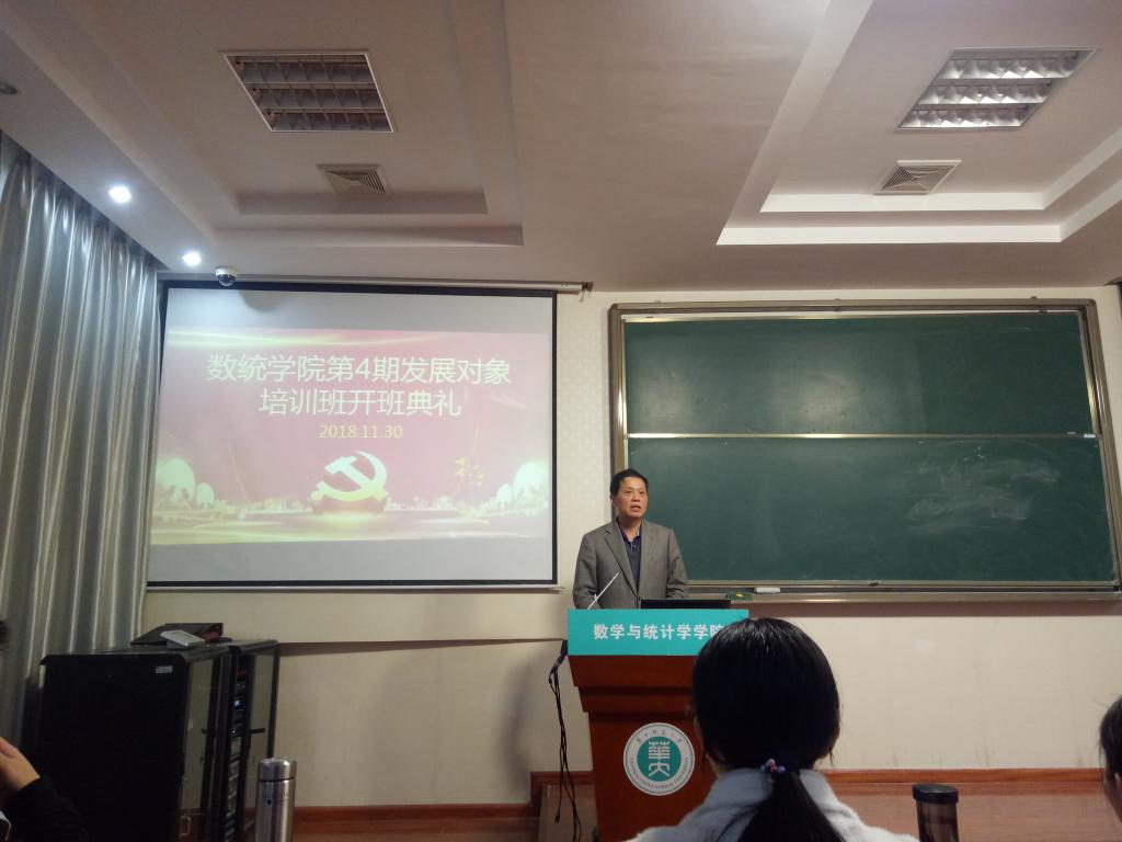 11月30日晚上,数学与统计学学院第四期发展对象培训班开班典礼暨第一次党课培训在六号楼6401举行,开班典礼由带队老师蔡雅主持,出席的嘉宾有院党委书记王中。共34名发展对象参加了此次典礼和培训。