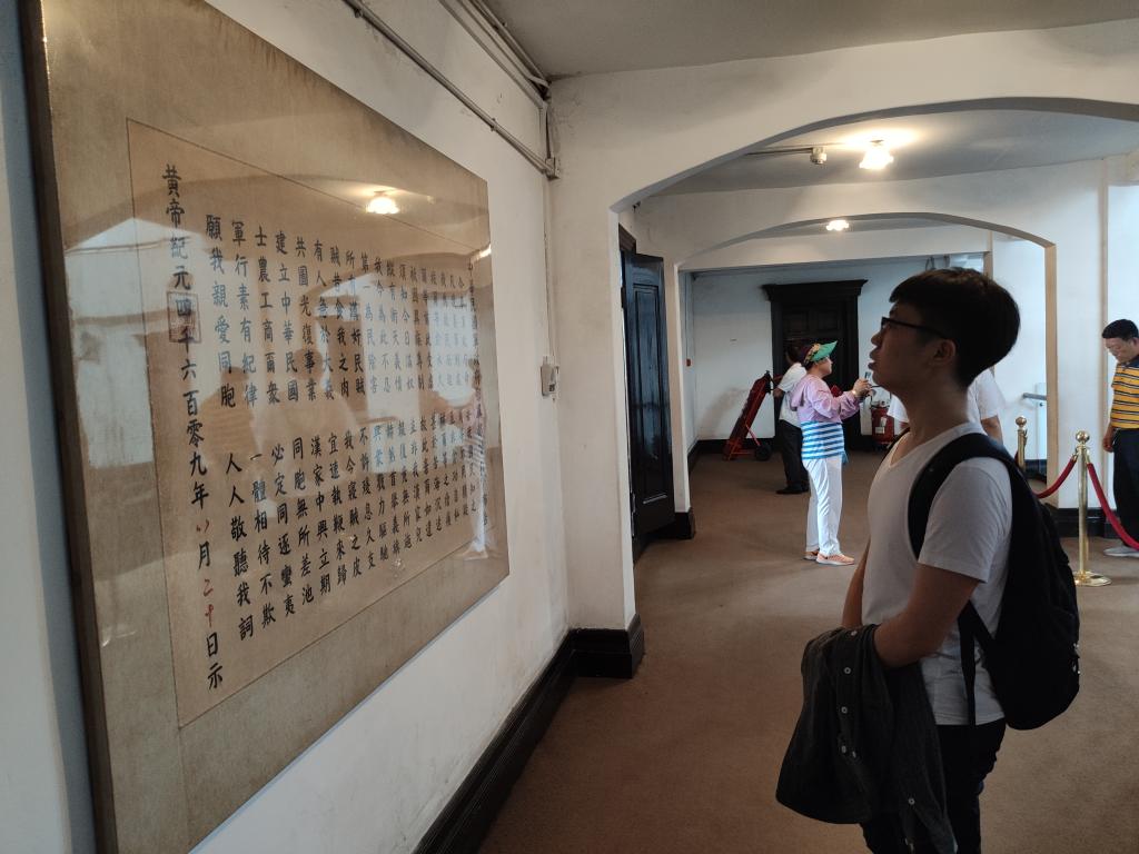 整个纪念馆保留有《鄂军都督府旧址复原陈列》和《辛亥革命武昌起义史迹陈列》两个基本陈列。前者位于都督府旧址的第一、第二层,也是小组成员们的第一个参观对象。顺着路线,同学们看到了旧址内的各个部门,里面的一些实物和历史旧照,生动地还原与再现了中国历史上第一个共和政权诞生地的历史风貌。而对于第二个陈列的参观,同学们学习到了许多课本上没有详细出现的历史知识,扩大了自己的知识面,对于那段革命的历史有了更为全面与深刻的认识。