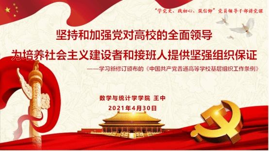 4月30日下午,我院党委书记王中在6415教室,为学院党委中心组成员、党委委员上了题为“坚持和加强党对高校的全面领导,为培养社会主义建设者和接班人提供坚强组织保证——学习新修订颁布的《中国共产党普通高等学校基层组织工作条例》”的专题党课。