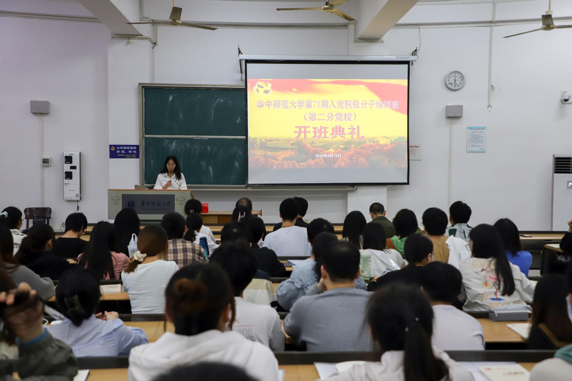 (通讯员 刘柏贞)4月19日晚,华中师范大学第71期入党积极分子培训班第二分党校开班典礼于9301教室举行,马克思主义学院(以下简称“马院”)副处职组织员刘方,数学与统计学学院(以下简称“数统学院”)党委副书记杨可军,马院组织员、本次培训班带队老师曾爱华,数统学院党务干事费蝶及全体学员参加。典礼由本次培训班班主任蔡子尧主持。