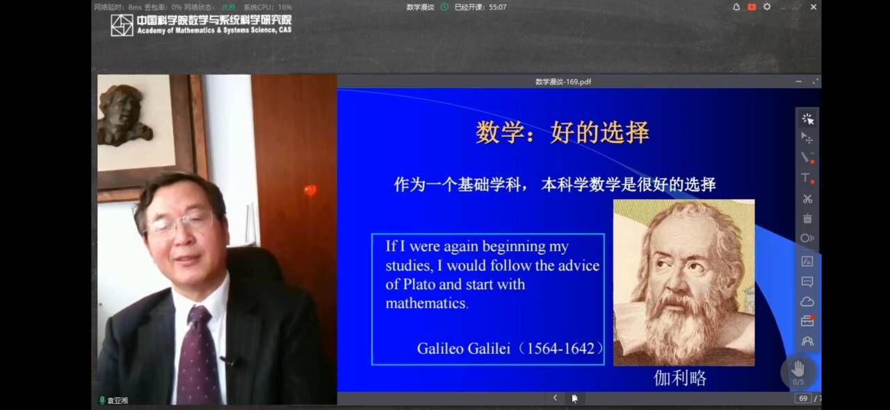 (通讯员 张燕娟 甄娜)新型冠状病毒感染引发的肺炎疫情发生以来,全国上下全力奋战、英勇奋战、团结奋战,形成了全面动员、全面部署、全面加强疫情防控工作的局面。为在全民抗疫、共克时艰的特殊时期向大中小学生宣传数学的奥妙,提升全社会的科学意识和科学素质,3月14 日下午,中国科学院院士、中科院数学与系统科学研究院研究员袁亚湘通过网络直播举行《数学漫谈》科普报告,华中师范大学数学与统计学学院(以下简称“数统学院”)组织各年级学生观看报告。