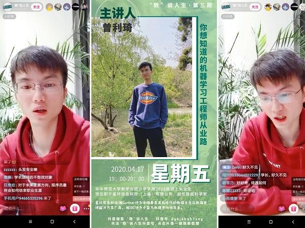 (通讯员 姚佳怡)4月17日晚,华中师范大学数学与统计学学院(以下简称数院)主办的“数”说人生第三期在抖音平台顺利开展。此次直播的主讲人,是数院2018届硕士毕业生曾利琦,现于上海星环科技有限公司担任数据科学家。此次讲座旨在向数院学子介绍数学专业学生在数据科学领域的发展之路。