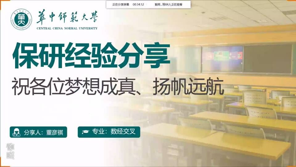 第一位分享人董彦祺,来自数学与经济交叉班,保研至复旦大学。在分享中,他介绍了保研在平均学分绩和排名、英语六级成绩、挂科情况三个方面的硬性要求,也提到了在保研过程中的加分项与各种招生方向。接着,他详细讲述了在数学专业方面实力强劲的院校特点,如北京大学、人民大学、南开大学等大学及其学院,从各高校各学院的侧重方向、考试难度等方面进行了分析讲解。董彦祺也分享了自己参加夏令营的参营体验与经验,从夏令营信息获取、简历制作、材料准备、面试经验四个方面展开,根据自身经历为学弟学妹们提供了切实有效的信息。