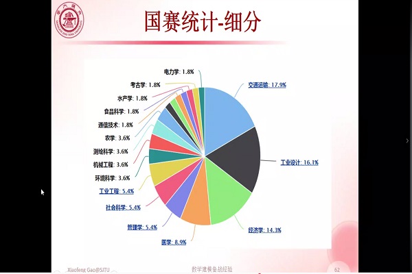 在讲述完成参赛论文的过程中,她指出写作手应该做到模块化写作,而非顺序式写作。随后她以一个参赛队伍为例,分析了备战比赛的方式,即团队构建、学习内容与模考。最后她就往年国赛题目的学科分支、题目类型、方法论、主题分类和命题走向进行了数据预测与统计,明晰了学生的解题思路,并总结了参赛选手应该具有的专业能力,包括专业软件的使用、可视化技术的应用、论文的写作等各项技能。