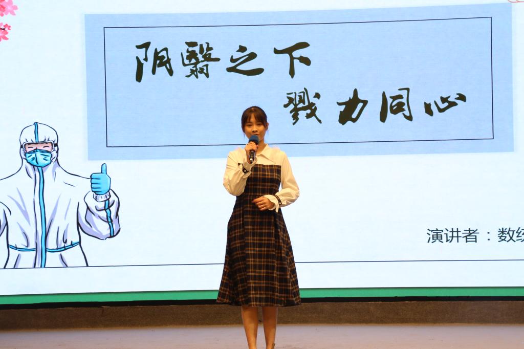 紧接着,第七位上场的选手就是史辰禹,她演讲的主题是“江山如故,黄鹤归来”。她通过疫情期间一直飘扬的网红窗帘引入演讲,发表了她对于疫情期间中国人民的表现的思考与感悟。在她的演讲之中,有为一国而封一城的英雄城市武汉,有与武汉“肝胆”相照的张伯宇院士,有“因为我穿着防护服,所以我不能哭”的朱海秀,有社区的志愿者,有居家隔离的每一个平凡人。史辰禹通过对每一个人的努力,刻画了战疫路程的艰难。在她演讲的最后,她说:“看到有些拥挤的二号线和人声鼎沸的校园,我心底有无限的感动,感动江山如故,白云尚在,黄鹤归来,汉阳树仍然郁乎苍苍,鹦鹉洲依旧芳草萋萋。”