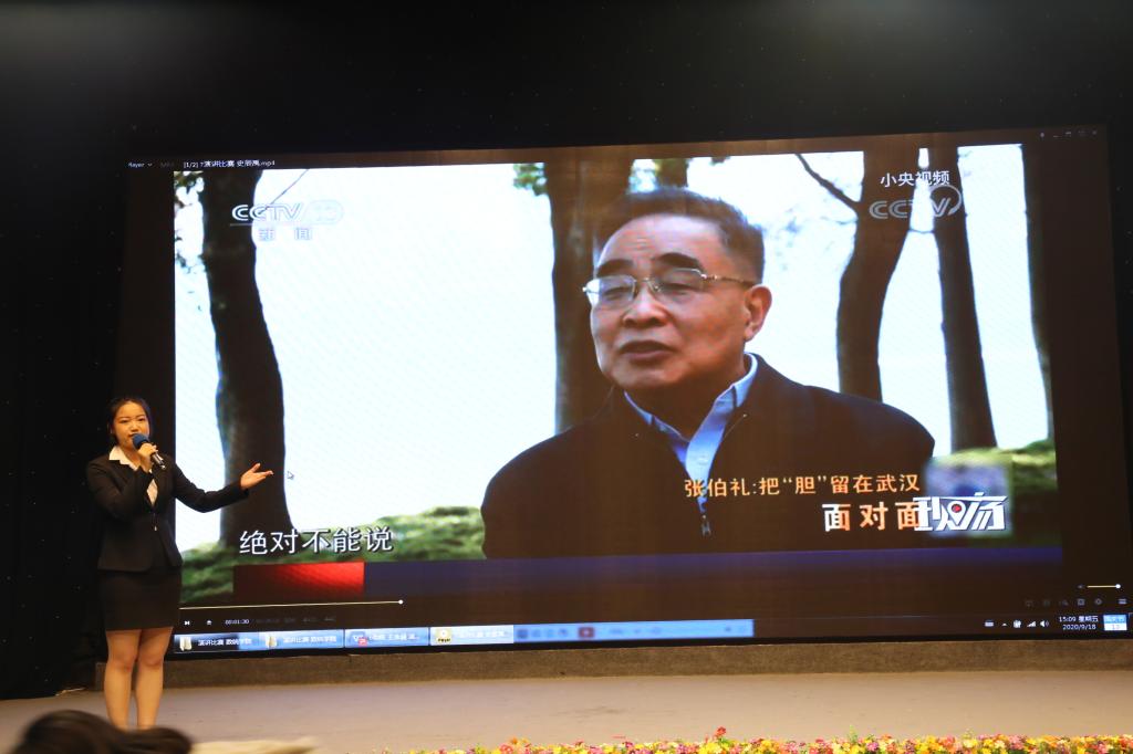 首先上场的是陈斓,作为全场第五位上场的选手,她全程沉着淡定,举止得体,围绕战疫故事完成了主题为“阴翳之下,戮力同心”的演讲。除了对中国人民抗疫过程的描述与感慨,她还结合了习近平主席在中央政治局常委会会议的发言来演讲。抗疫过程不只是医疗卫生问题,更是全国各方面的工作。抗疫胜利的荣耀也不只属于医护人员,更是属于每一位中国人。在演讲最后,陈斓还加入了一段舞蹈,不仅丰富了自己的表现形式,也深化了演讲主题,给评委留下深刻印象。
