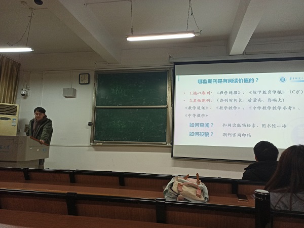 分享会伊始,宋帅向与会人员介绍了主讲人曾鑫洋,并表示:“曾鑫洋的科研及获奖经验丰富,相信大家听完他的分享一定会收获颇丰。”紧接着曾鑫洋围绕“基本讯息”、“课题申报”、“论文撰写”三个部分展开数学教育科研分享。首先,曾鑫洋介绍了科研的基本讯息,展示了相关的数学期刊,并指出阅读有价值期刊的重要性。他指出:“本科生应认真学习如何查阅期刊和如何向期刊投稿的方法途径,做到未雨绸缪。”而后曾鑫洋展示了具体参加科研的渠道,并向大家推荐了“经验总结”“调查研究”“内容分析”三类教育科研。