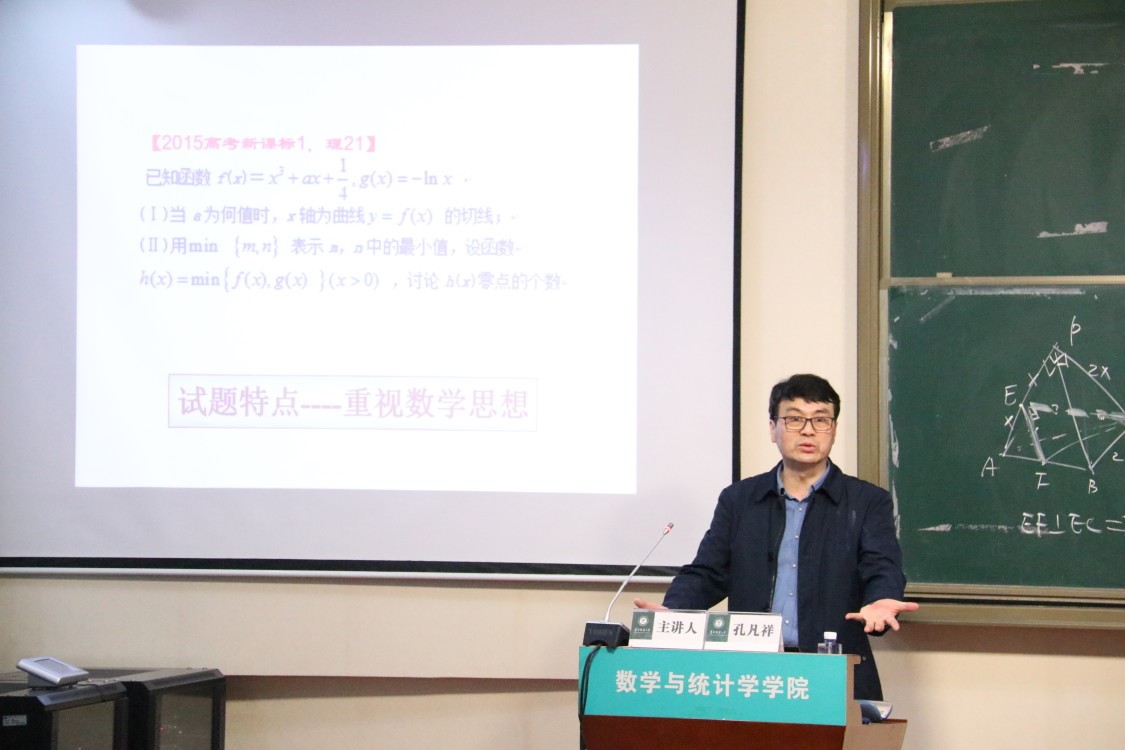 (通讯员 杨淋)4月23日下午,为切实提升学生从师任教的专业水平,帮助师范生有效掌握高考试卷设计的技巧和方法,数学与统计学学院试卷设计专题沙龙在6号楼6401报告厅顺利举行。此次专题沙龙特邀湖北省特级教师、武汉市高中数学学科带头人、武汉市教育学会中数会理事孔凡祥老师担任主讲人,数学与统计学学院胡典顺教授、本科生辅导员王奥林、陈锦辉和张子规作为嘉宾出席活动现场。本次活动由本科生辅导员王铭歆主持。
