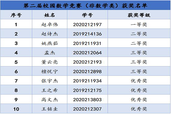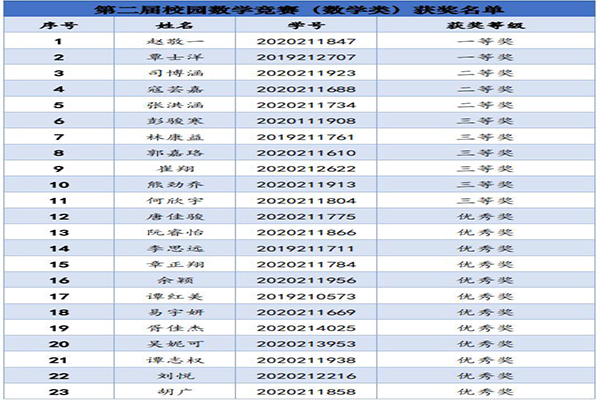 赛后,阅卷老师将依次评阅参赛选手上交的试卷,并根据计算过程、计算结果、题目的整体把握和答题思路等详细标准对所有选手的试卷打分。经过3天的评阅和统计,本次大赛中数学类共评选出一等奖2名、二等奖3名、三等奖6名和优秀奖12名。同时,非数学类共评选出一等奖1名、二等奖2名、三等奖3名和优秀奖4名。