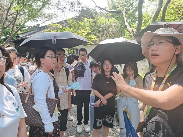 实践队员抵达中国四大名园之一的苏州拙政园,近距离感受江南地区传统民俗建筑多进的格局以及极具水乡特点的文化氛围。在讲解员的介绍下,实践队队员学习了拙政园中的不同建筑布局,及其布局中所运用的分割空间、对比借景等传统建筑造景手法。此次美育教育,加深了实践队队员对中华传统文化中建筑、风水布局等方面的理解,帮助队员们感悟传统文化对新时代青年学子的引领作用。