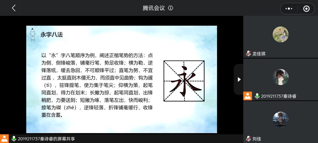 (通讯员 龙佳琪 秦诗睿)为提高支部成员的汉字书写水平和普通话水平,营造良好的语言环境,促进师范生教育教学能力的综合提升,由华中师范大学数学与统计学学院(以下简称“数统学院”)1901团支部举办的汉字书写及普通话测试经验分享会通过腾讯会议APP顺利进行。本次分享会由1901班长秦诗睿和团支书吴雨格担任主讲人。1901团支部全体成员参与此次分享活动。