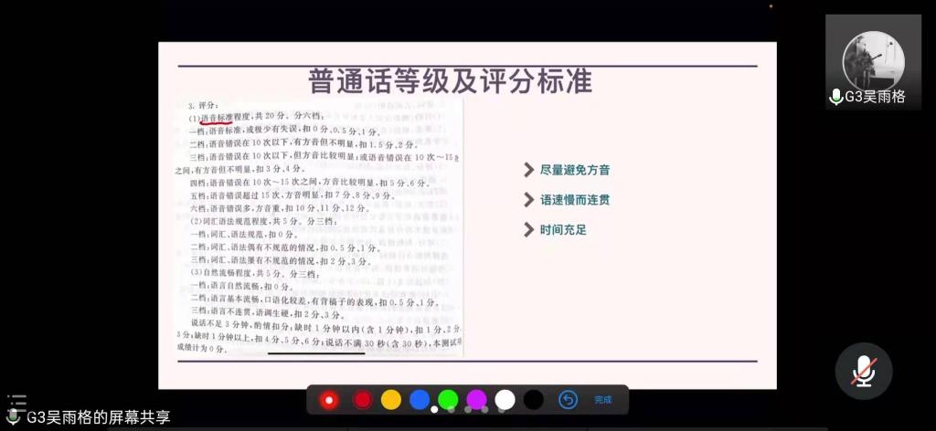 分享会的第二位主讲人吴雨格主要从如何说好普通话、普通话考试流程与普通话考试题型三个方面进行分享。她强调了测试时要尽量避免方言、语速要慢而连贯、尽量避免失误,在说话测试中不得背诵现成文章等考试中的注意事项。她也着重讲解了考试技巧,在各个题型.上都作了十分详细的解说,并给出实用性的建议。她指出:朗读短文切忌矫揉造作,要准确把握文章的感情基调;命题说话要提前准备,注意语言的流畅性和文章结构,不建议使用网络用语,同时要注意把握时间。